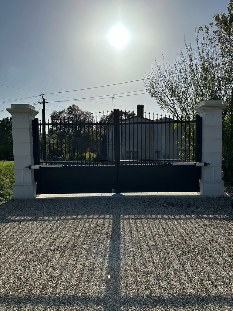 Pose d’un portail battant en aluminium style fer forgé de couleur ral 9005 noir motorisé sur la commune de Frontenac dans le Libournais.